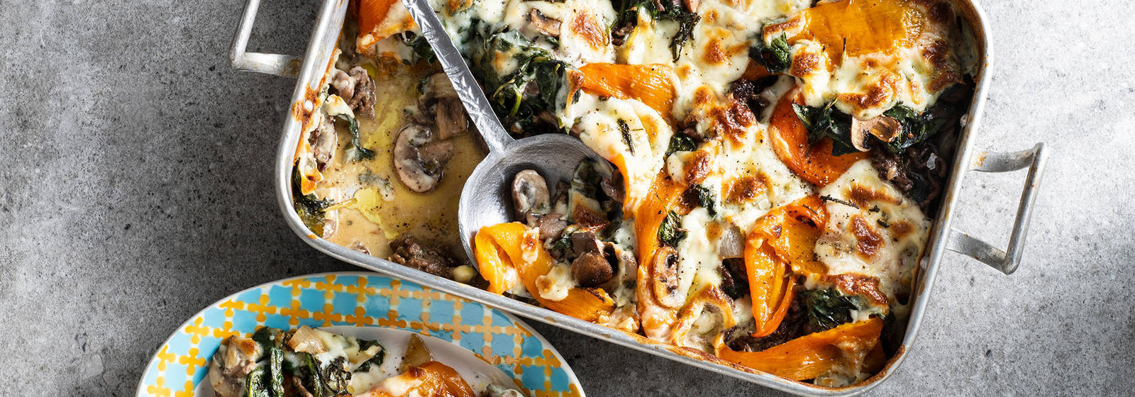 Soğan, kestane mantarı, közlenmiş biber, adaçayı, yağsız kıyma ve ıspanaklı düşük karbonhidratlı lazanya.