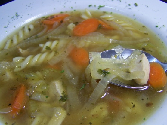 Bu çorba, Fransız Soğanı ile karıştırılmamalıdır. Tavuk suyuna eklenmiş karamelize soğan, ezici olmadan yeterli lezzet verir. Kavrulmuş piliç ve Mmmmm-Mmmmmm iyidir.