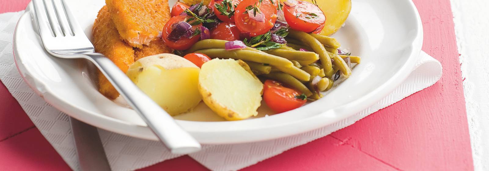 Lezzetli bir Hollandalı tarifi. Ana yemek şu içerikleri içerir: balık, patates ((bir parça ufalanmış kilo), yarıya kadar), Fransızca (yeşil fasulye (440 gr drene edilmiş), balık kroket parmakları (somon (10 adet, dondurulmuş)), zeytinyağı, kırmızı soğan (kıyılmış) , kurutulmuş kekik (saksı 12 g), kiraz domatesleri (250 g) ve yarıya).