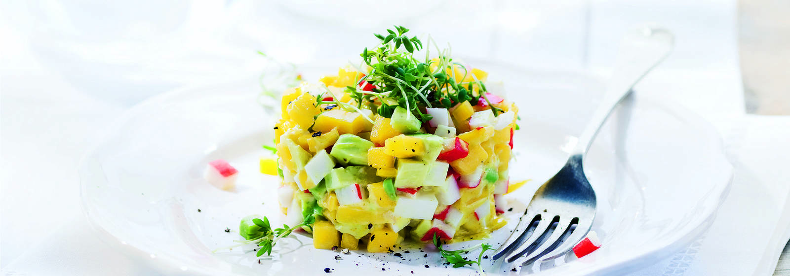 Surimiflakes, avokado ve mango ile taze tartar