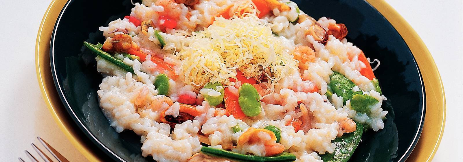 Arpacık soğanı, havuç, kar bezelye, bahçe bezelye, deniz ürünleri ve baharatlı peynir ile İtalyan risotto.
