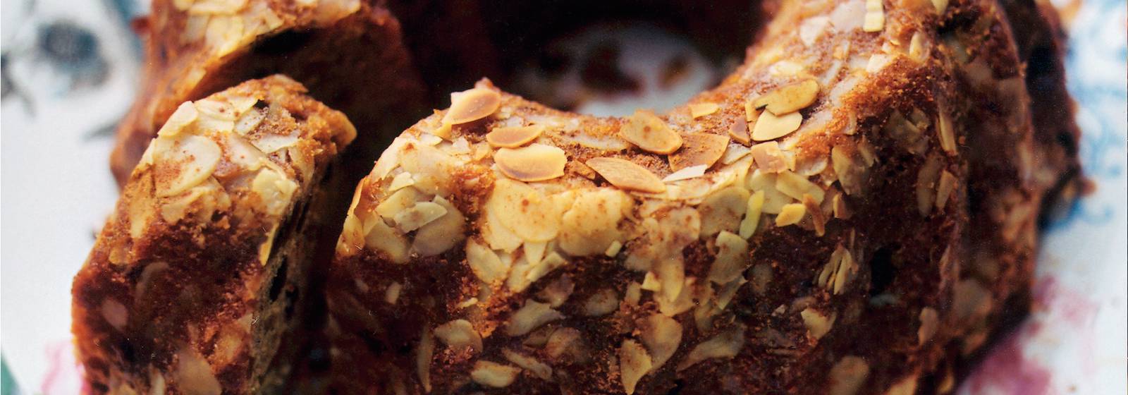 Yağlanmış ekmek kalıbına badem talaşı ve kaşıkla serpin. Zencefilli fırının ortasında 45 dakika kızartın.