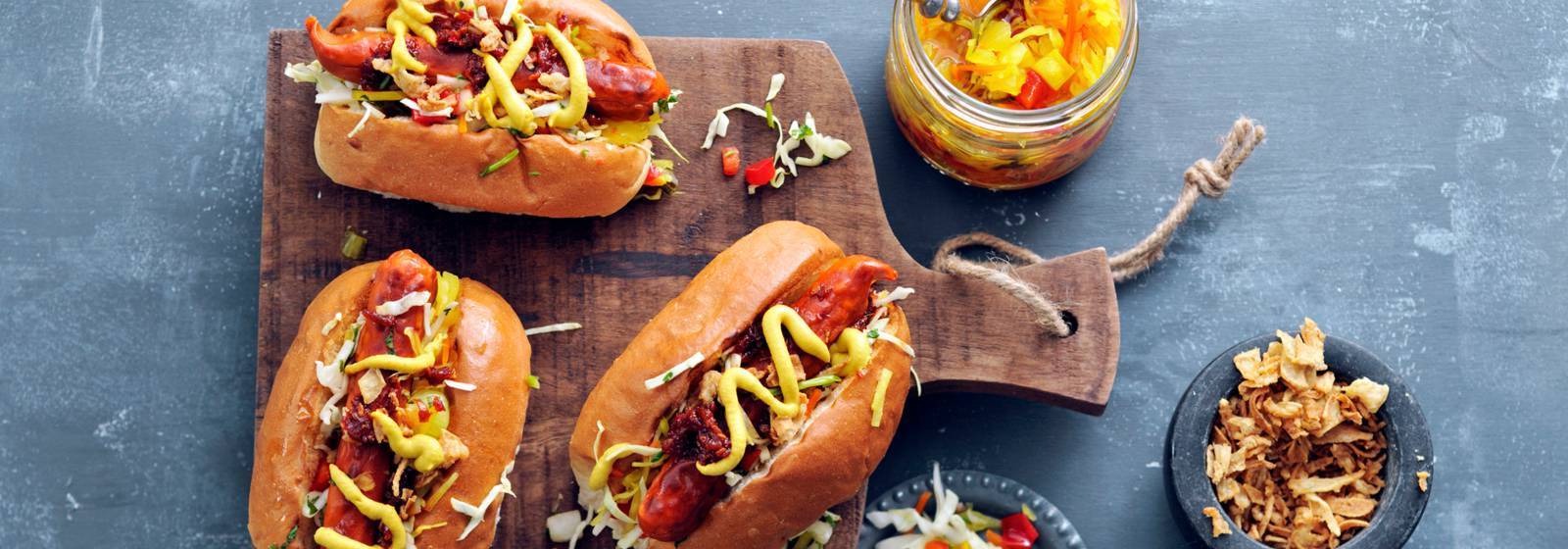 Sebze soslu sosisli. Bu ne kadar hoş? Çiğ sebzeler, atjar, sambal ve kızarmış soğan ile daha da iyi olur. Ve unutma: hardal