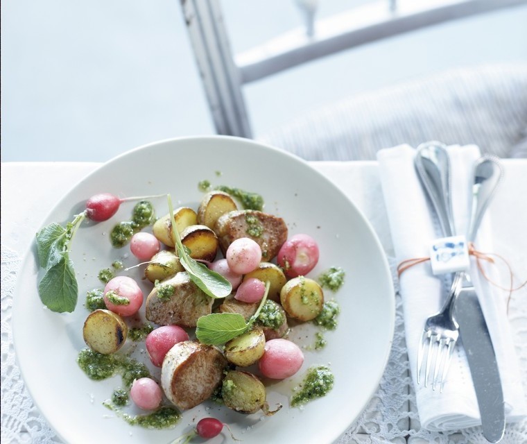 Domuz eti bonfile turp ve patates ile servis yapın ve etrafındaki yeşil sostan bir miktar dökün.
