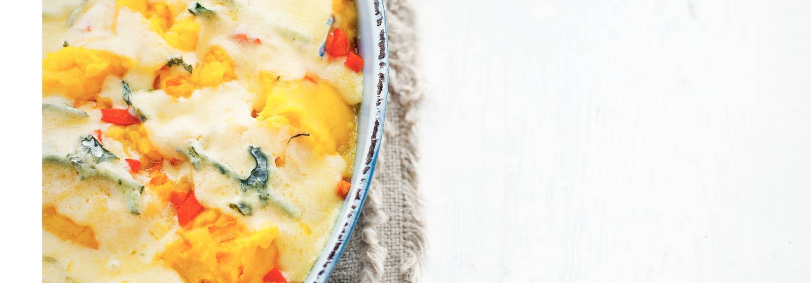 Patates, balkabağı, ekşi krema, kırmızı biber ve bluefin peyniri ile vejetaryen Hollanda yemeği.