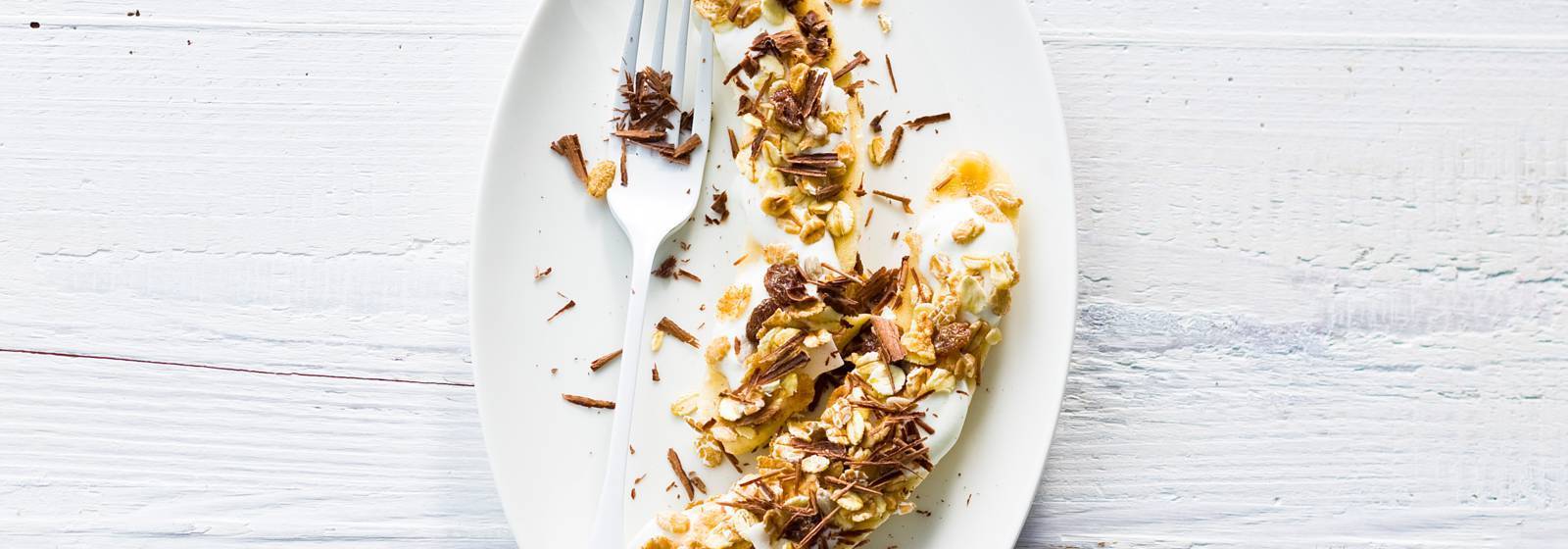 Yoğurt, muz, müsli ve ekstra bitter çikolata ile kahvaltı