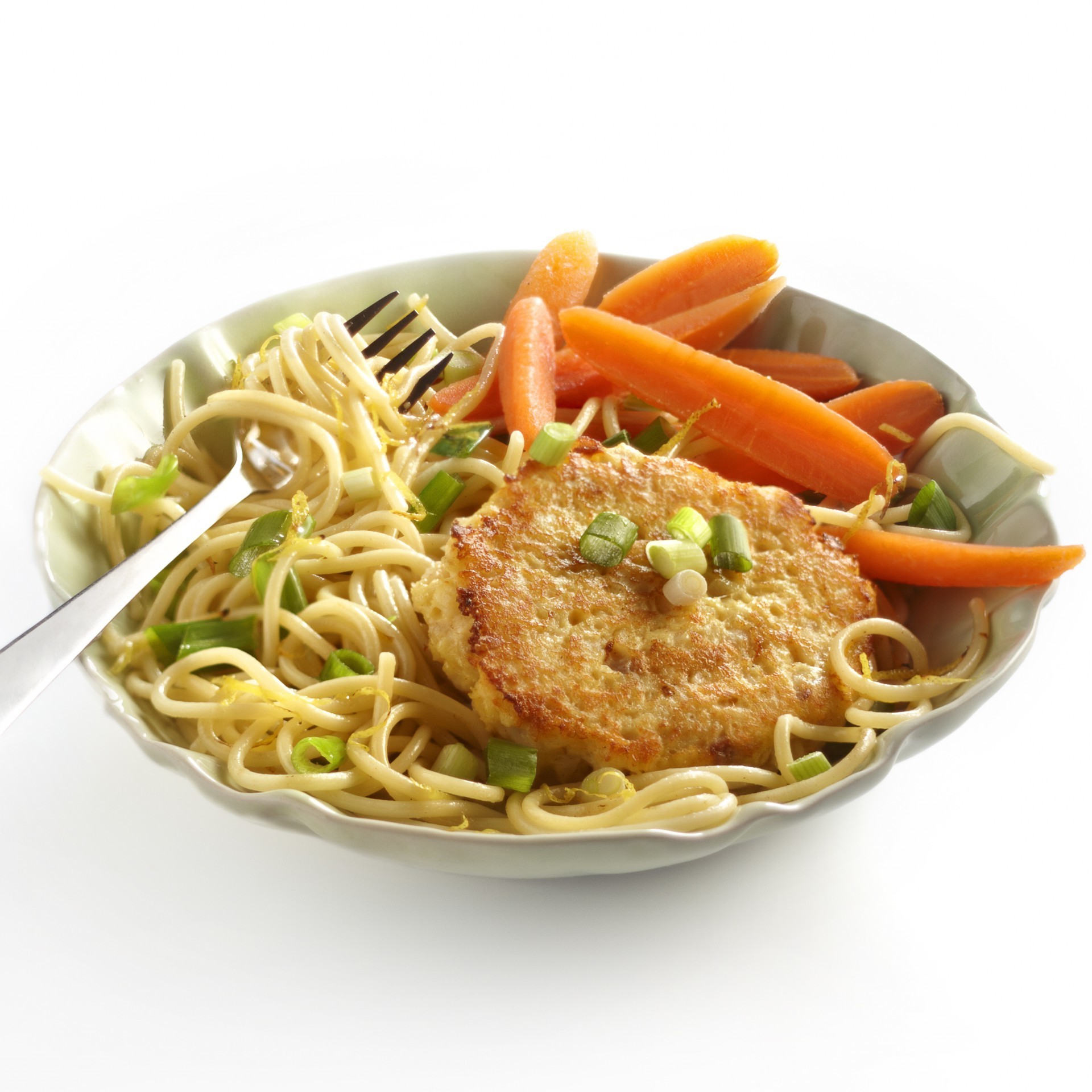 Makarnayı balık burger ve havuçla birlikte servis edin. Taze soğanın kalanıyla serpin.