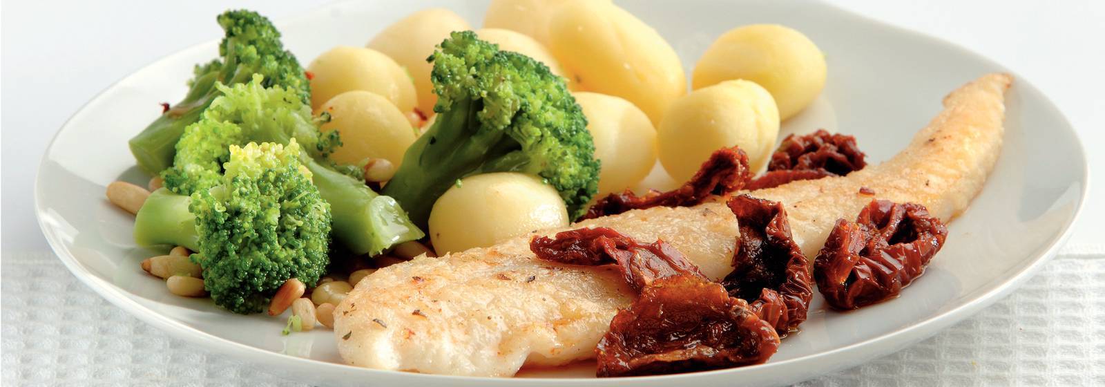 Lezzetli bir Hollandalı tarifi. Ana yemek şu içerikleri içerir: balık, kurutulmuş domates (pomodori secchi, saksı 280 g), pangasius filetosu (doğal (balık)), yavru patates (450 gr), brokoli (yaklaşık 600 gr) ve çam fıstığı (65 gr).