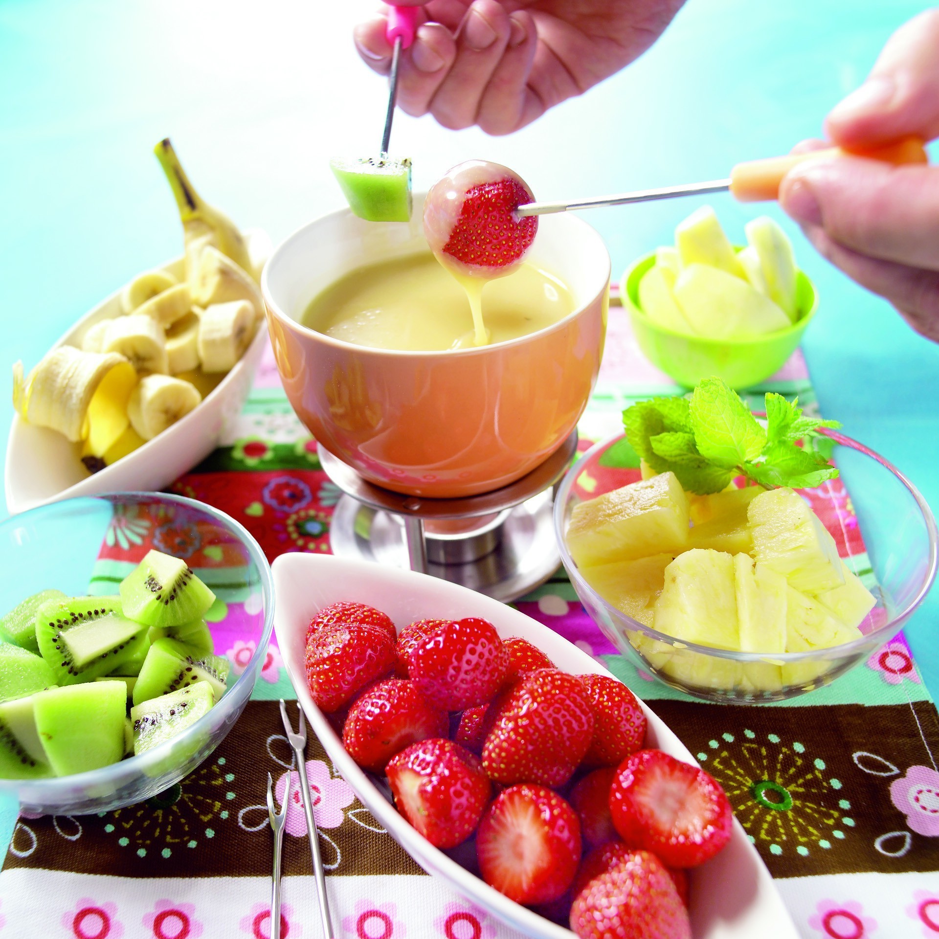 Meyve parçalarını fondü çatalına dökün ve fondü içine daldırın.