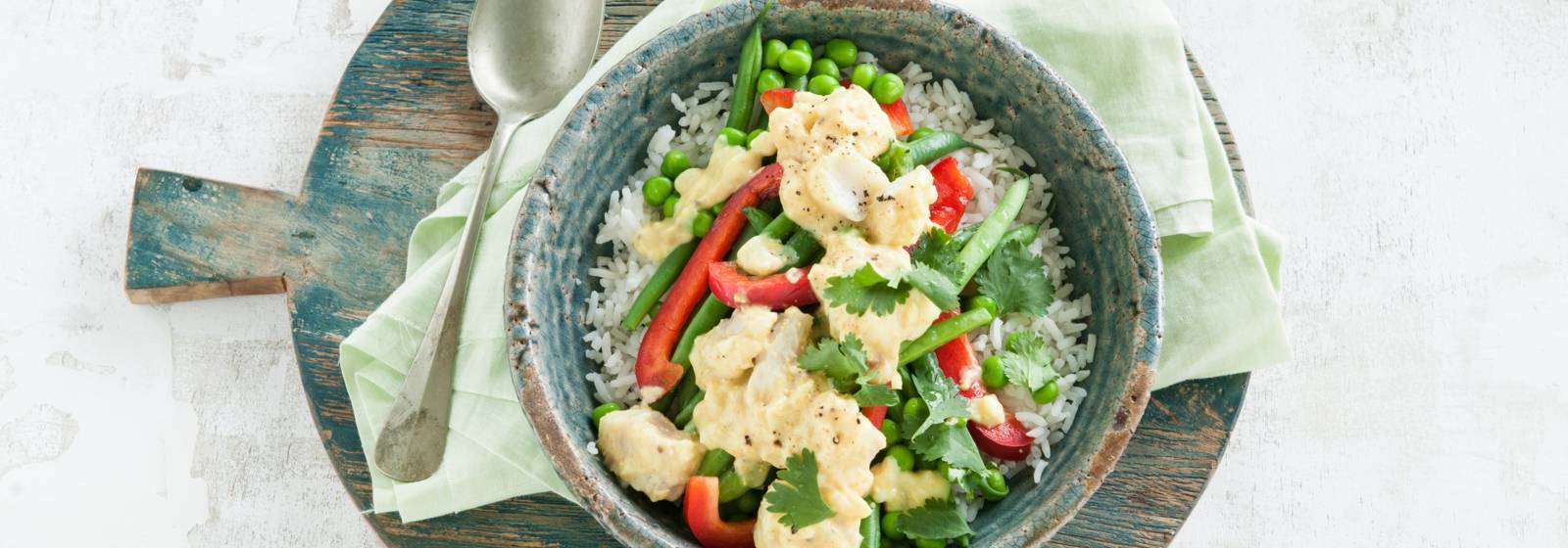 Yeşil fasulye, kırmızı biber, asma bezelye, morina, kişniş ve Bengalce hindistancevizi soslu pirinç yemeği.