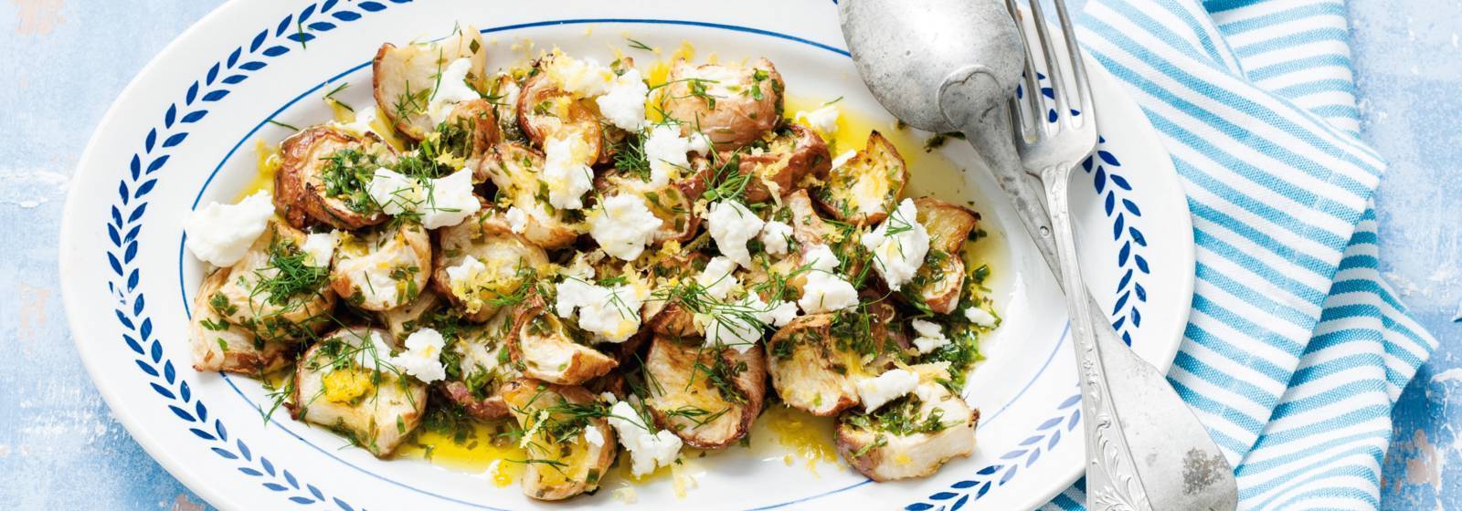 Kızartma suyunu bir kaseye bölün ve beyaz peynirin üzerine koyun. Dereotu ve limon kabuğu rendesinin geri kalanıyla süsleyin.