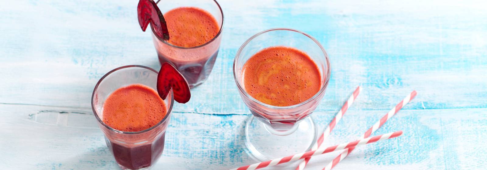 Meyve sıkacağı altına bir kutu koyun. Pancar, elma, havuç ve greyfurt sıkacağı boyunca birer birer itilir. Suyu 4 bardağa dökün.