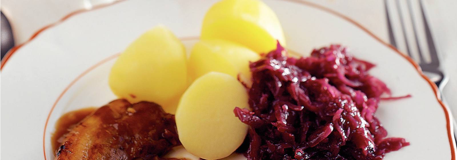 Patatesleri, kırmızı lahanayı ve pastırma sosu ile dört tabağın üzerine yayın..