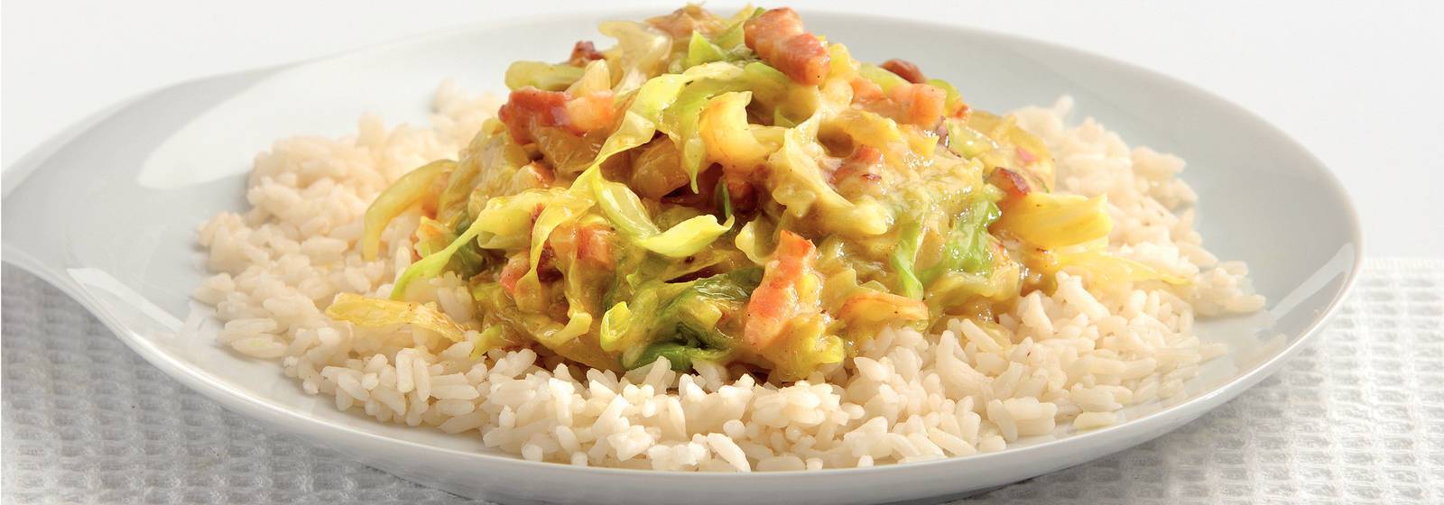 ısıtma wok ve 3 dakika pastırma pişirin. 5 dakika lahana, soğan ve sarımsak pişirin. Köri tozu, sebze sosu ve su ekleyin.