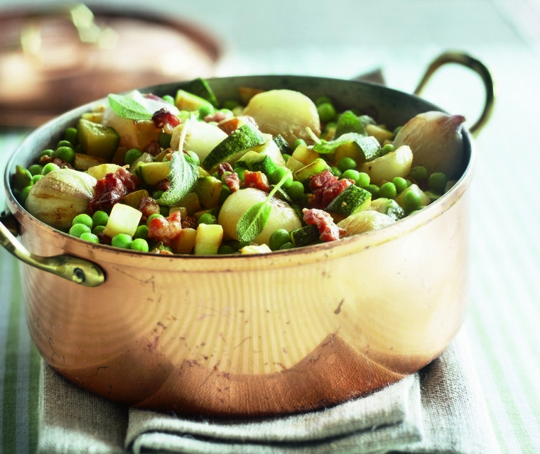 Tava üzerinde kapaklı sebzeleri yaklaşık 10 dakika güveçleyin. Tuz ve karabiber serpin.