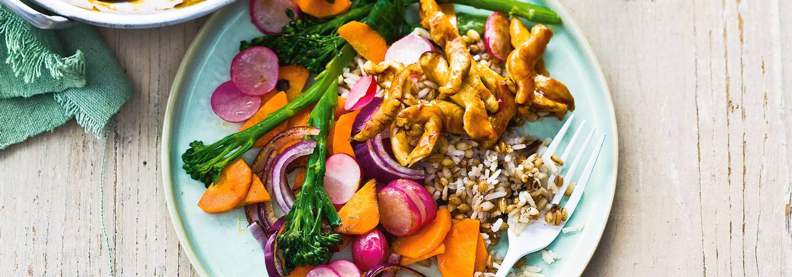 Teriyaki soslu tavuk, tahıllı pirinç, kış havuç, kuşkonmaz brokoli, turp ve kırmızı soğan.
