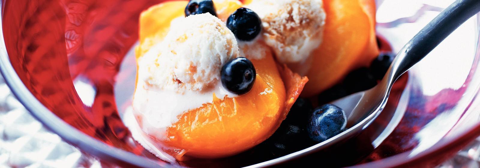 Tatlı şarap ve acıbadem kurabiyesi dondurma ile sıcak şeftali